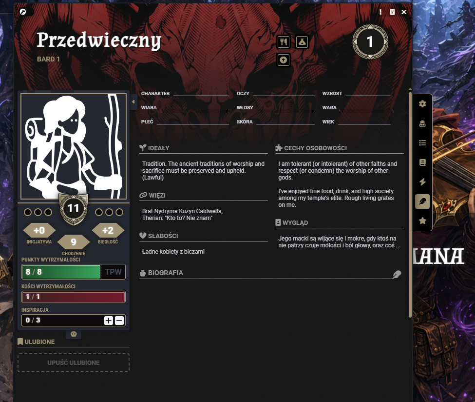 W naszym przypadku na potrzeby poradnika mamy kartę postaci o nazwie "Przedwieczny" (znajdującą sie w folderze "Tutorial"). Po dwukrotnym kliknięciu lewym przyciskiem myszy (LPM) pojawi się karta postaci.
