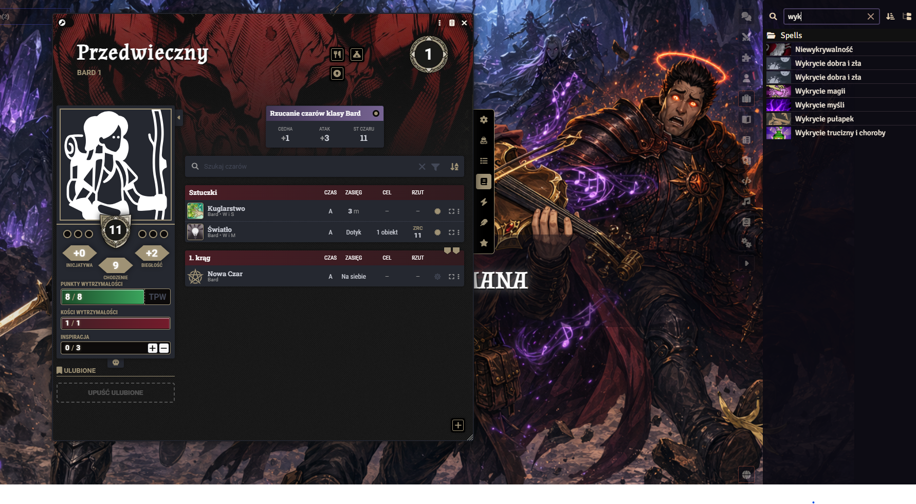 Aby dodać czar: należy w prawym menu (w tym gdzie wybieraliśmy postacie) wybieramy Przedmioty, natępnie wchodzimy w katalog Spells możemy użyć wyszukiwarki powyżej nazwy katalogu, aby znaleźć czar, następnie należy go kliknąć i przesunąć na swoją kartę postaci.