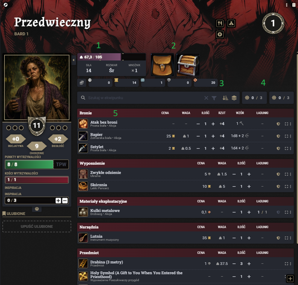 5.2 EkwipunekBroń, pancerz, przedmioty użytkowe i wyposażenie postaci.