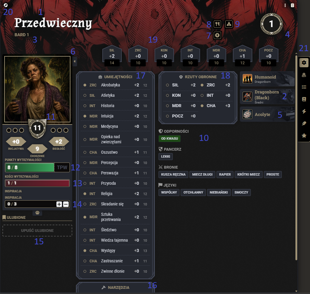Rasa - pokazuje rasę postaci. Bonusy rasowe są automatycznie dodawane do cech, a odporności i języki są dodawane do odpowiednich sekcji.