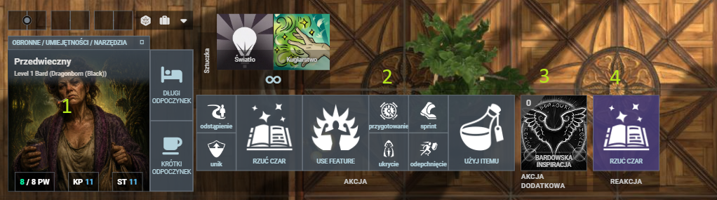 Jeżeli Twoja postać rzuca czary, w tym miejscu mamylistę sztuczek oraz czarów pogrupowanych według poziomów. Zaklęcie jest przygotowane gdy ⚙ jest poświetlone, jeżeli chcesz przygotować czar, kliknij na niego.