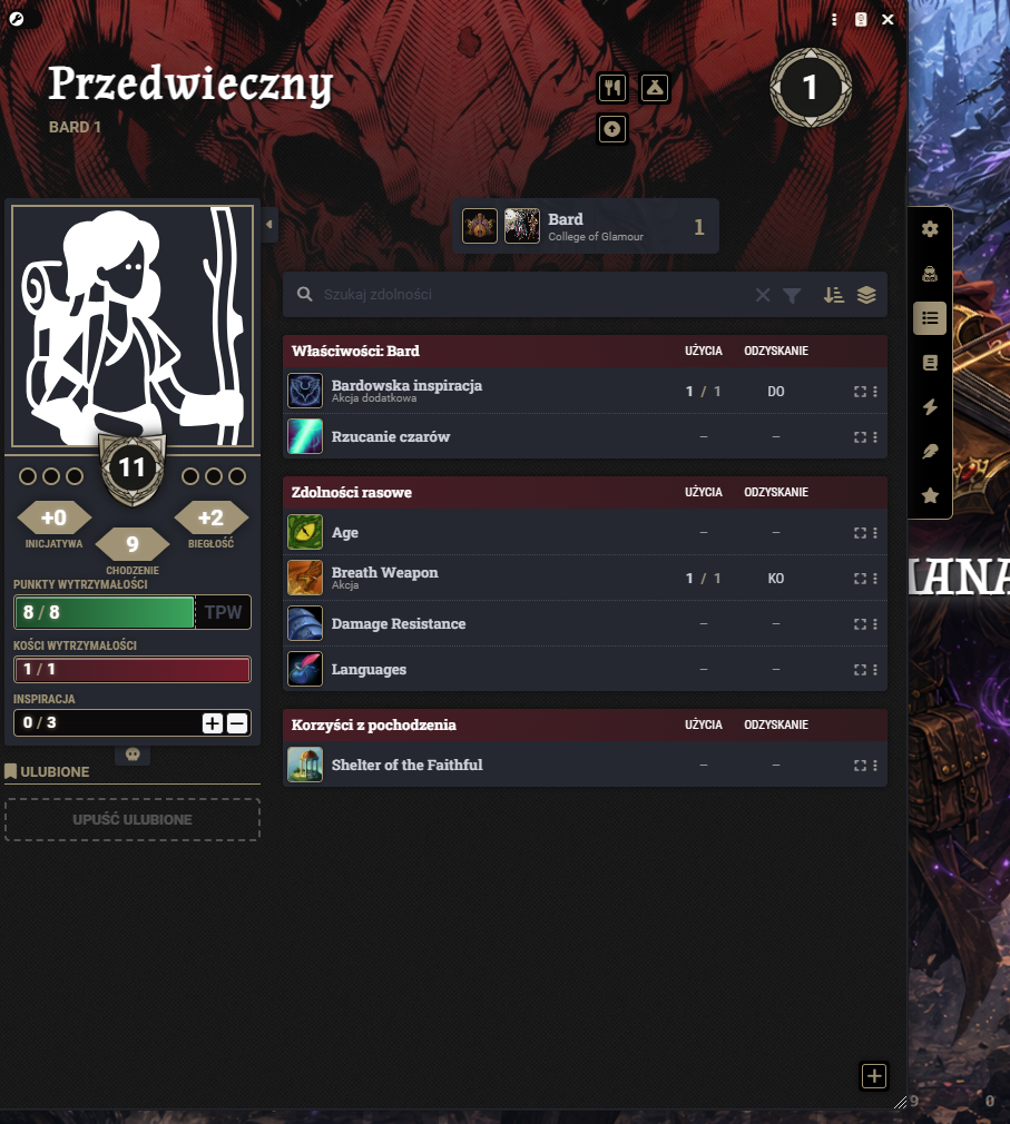 W zakładce zdolności znajdziesz klasowe, rasowe i inne specjalne zdolności (featy) postaci. Są one także pogrupowane w odpowiednich kategoriach np. jak na przedstawionym screenie mamy właściwości Barda, zdolności rasowe, oraz kożyści z pochodzenia.